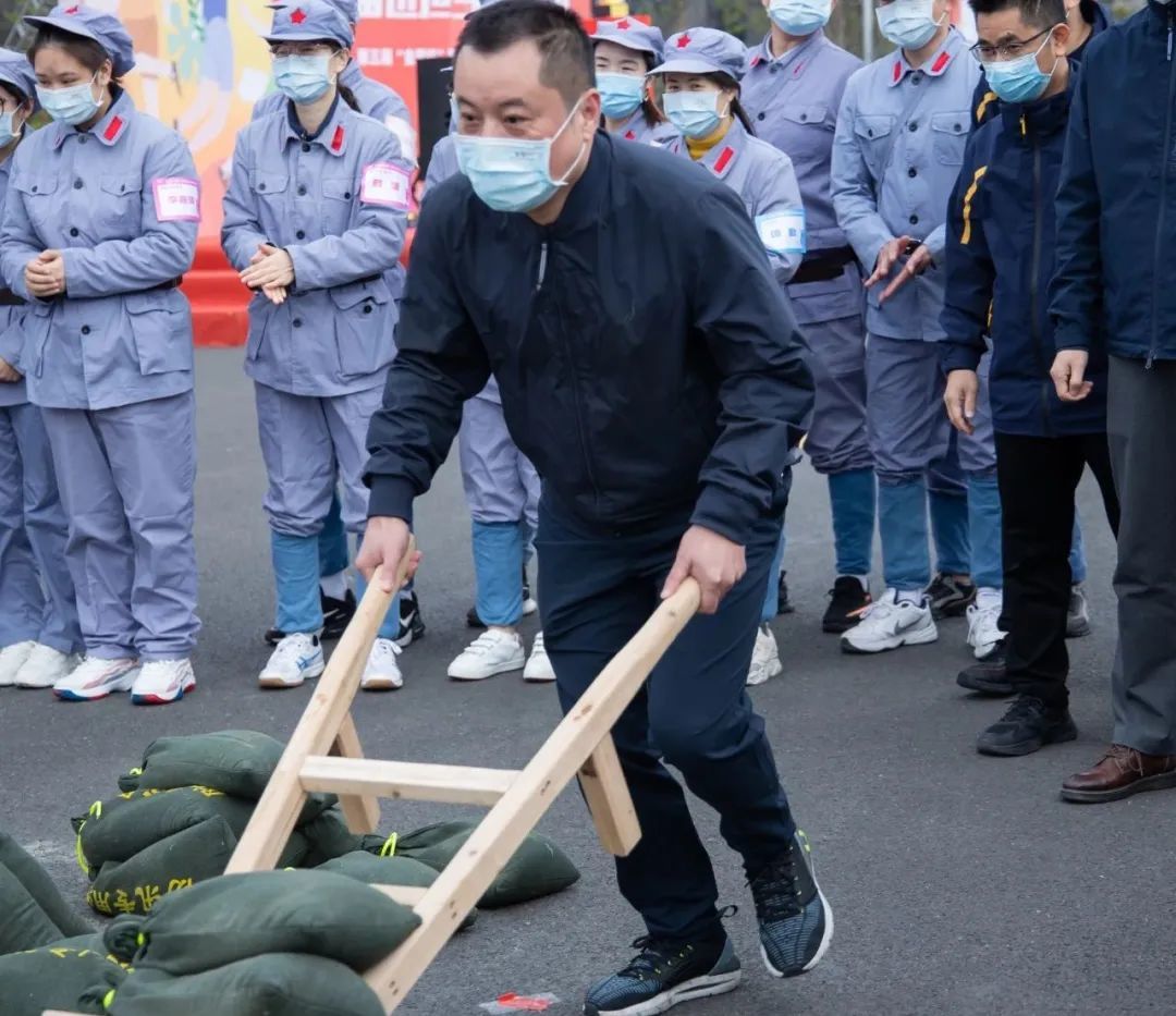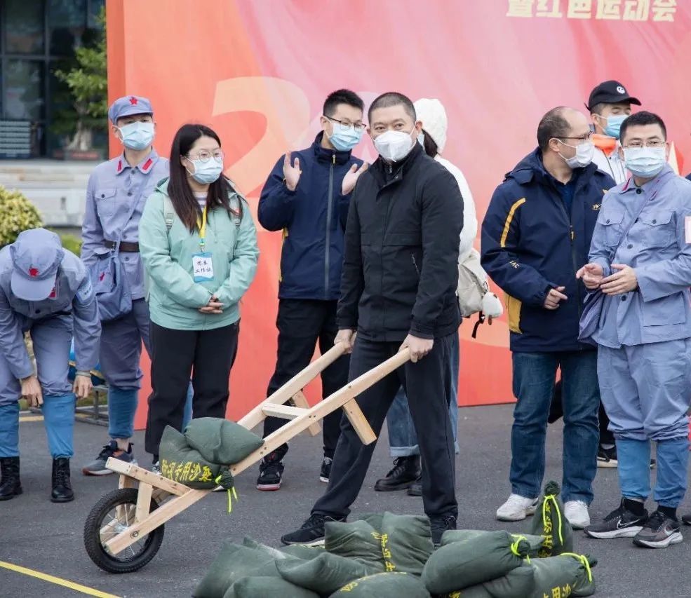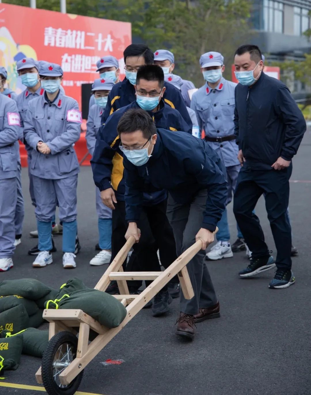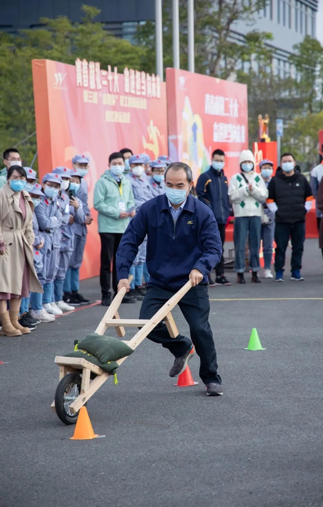 开场热身赛,姜总、邹总、王总以及各分会主席为运动员展示“独轮车支前”项目。