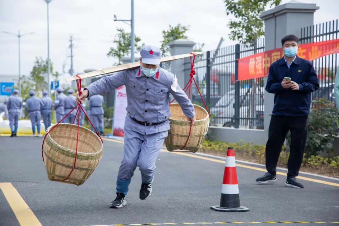 项目四、朱德的扁担,运营分会提供项目,9男1女,团队每人进行挑粮接力,(赛道为15米往返) 。从起点运输到终点再回到起点,并与下名队员击掌,以此类推,以最后一名队员完成比赛结束计时。