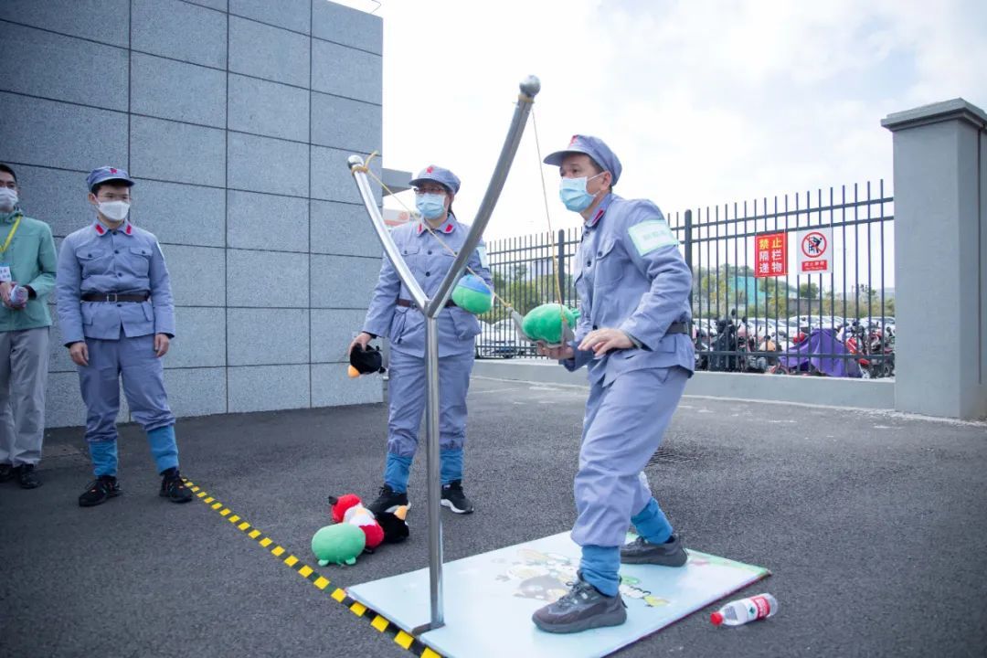 项目二、英雄炸碉堡,合金分会提供项目,9男1女,1名队员利用超级大弹弓发射“小鸟(玩偶)”,接收方在场外排队,手持容器依序每次1人进入接收方活动区域接收“小鸟”。最终以接收“小鸟”个数作为总成绩比拼。