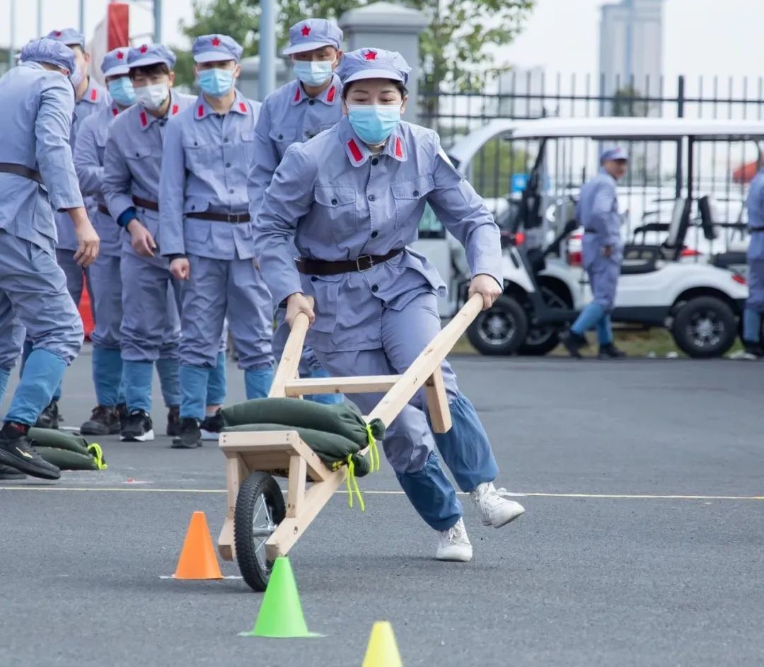 项目五、独轮车支前,总工会提供项目,9男1女,为了给前线的战士军营运送物资(沙袋),每位队员接力出发,运送物资穿越障碍,抵达终点(赛道为15米往返),卸下物资后推动独轮车返回起点,与下一名队员击掌接力,以此类推,完成20个沙袋运送的总共用时作为本队的成绩。