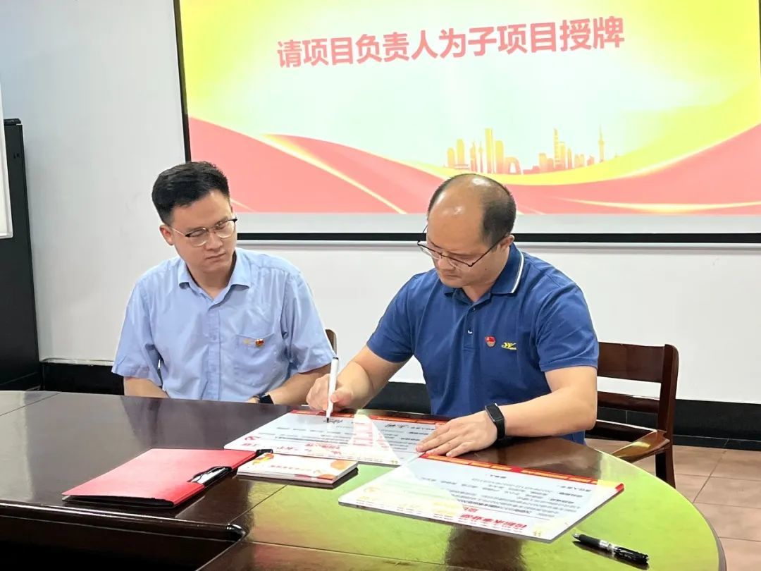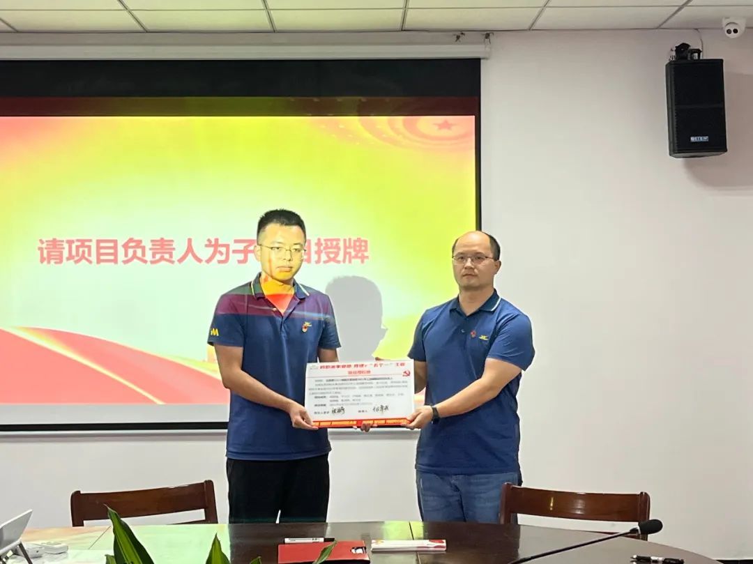 授旗结束后,项目总负责人龙本夫分别给三个子项目负责人进行授牌。接着,各子项目负责人给全体党员颁发“党员先锋岗”立牌,希望各党员敢于亮身份、践承诺、当先锋、做表率,激励全体党员干部职工树立看齐意识,对照先进找差距,立足岗位争先锋,齐心协力建设 “五个一”工程。