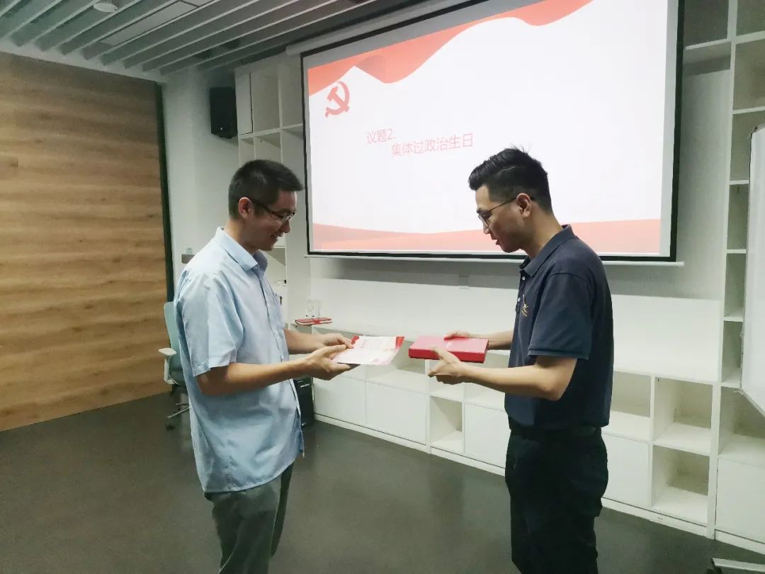 接着,支部组织党员集体过政治生日,由支部书记林亮亮分别为党员代表颁发生日贺卡和红色笔记本,另外林书记还带领大家面对党旗重温入党宣誓,句句铿锵有力,不忘入党时的初心与责任!