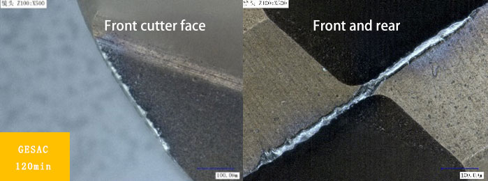 Nach dem Vergleich des Abriebs der hinteren Fräsfläche nach 120 Minuten Bearbeitung unter gleichen Arbeitsbedingungen beträgt der Abrieb des GESAC-Fräsers 0,027 mm und der des Fräsers der Firma B bis zu 0,049 mm. Aufgrund der brandneuen Generation der starren Stahlbeschichtungseigenschaft von GESAC verdoppelt sich die Eigenschaft des GESAC-Fräsers die ähnlicher Produkte von Unternehmen B.
