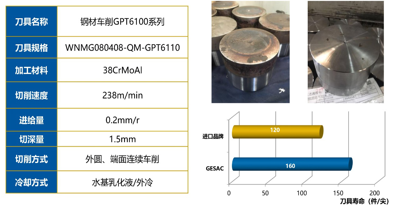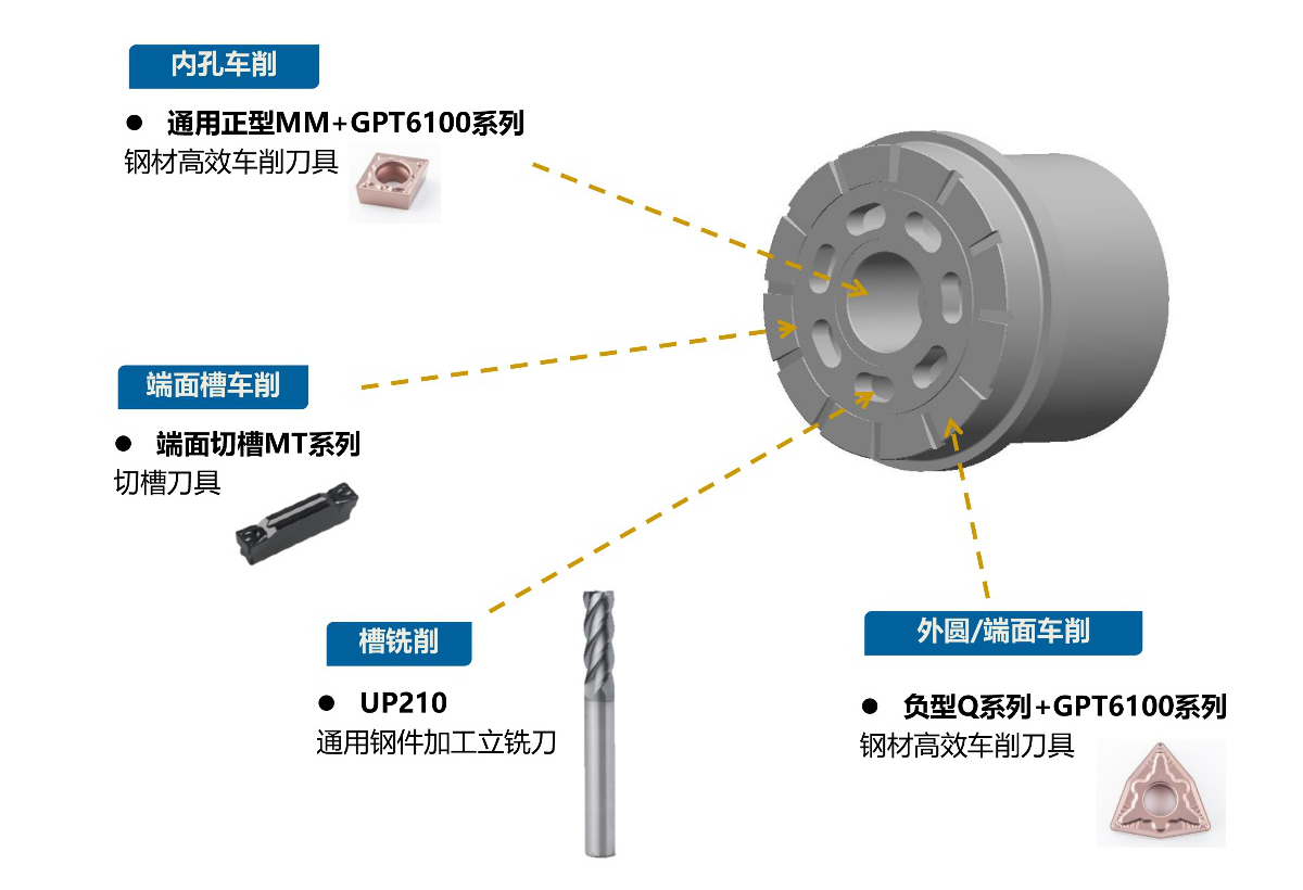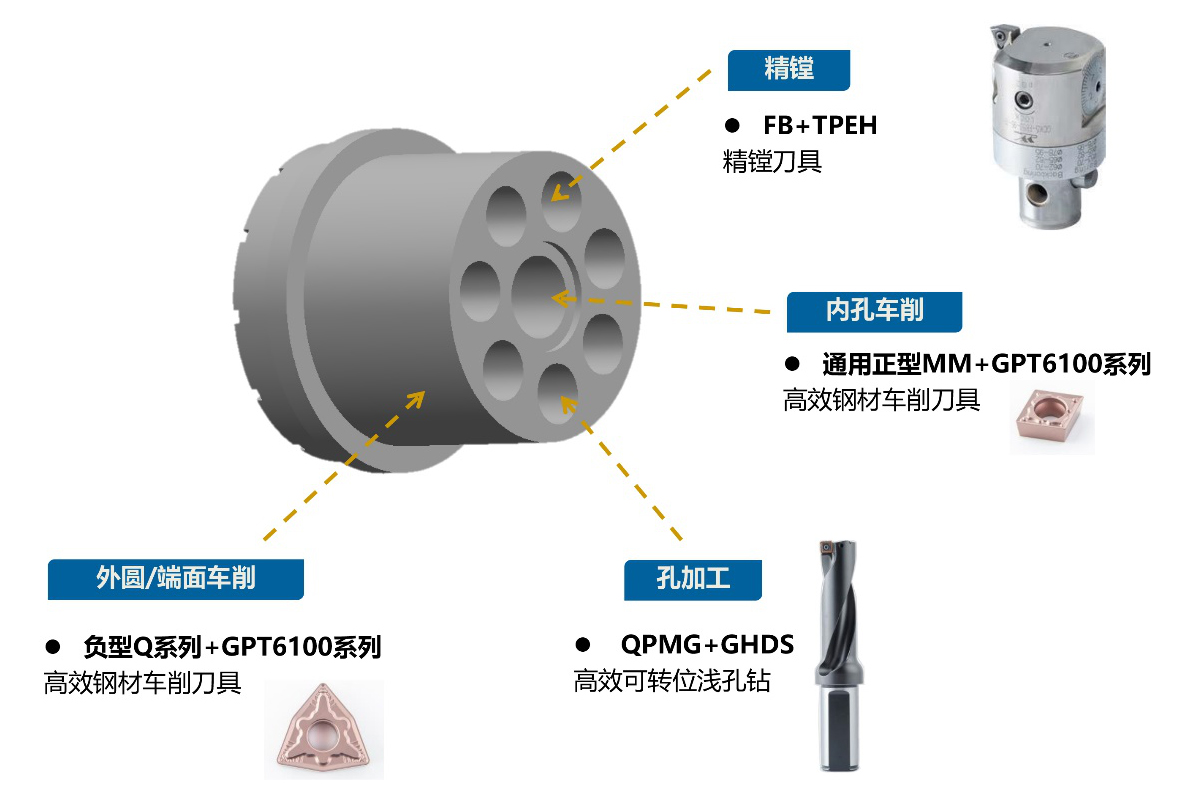 柱塞泵缸体外圆、端面车削加工,在相同工况情况下,我司QM+GPT6110组合比进口品牌同类刀具寿命提高约30%。