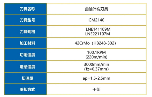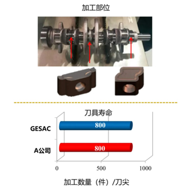 本案例为乘用车曲轴主轴颈加工案例,在相同工况下,我司刀具极限寿命与进口刀具一致,满足客户强制换刀寿命要求。