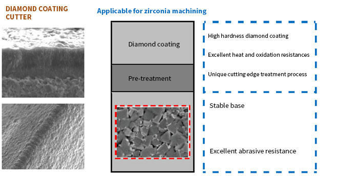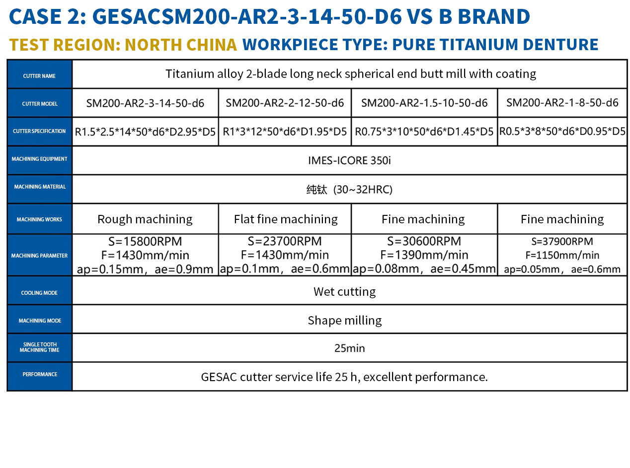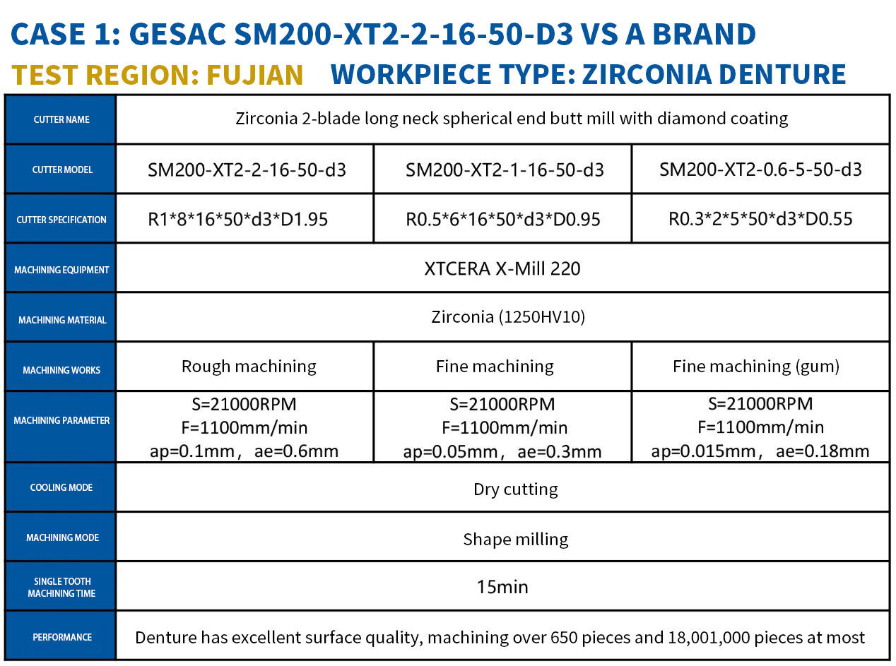The case is the machining case of zirconia rough. Under the same working condition, SM200 series two-blade long neck spherical end butt mill with diamond coating improves its service life by 8%, comparing with that of the cutters from Company A (a competitor).