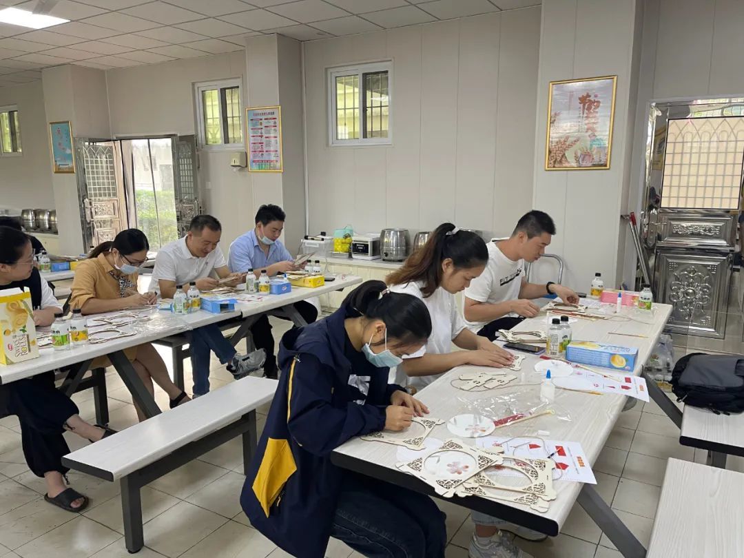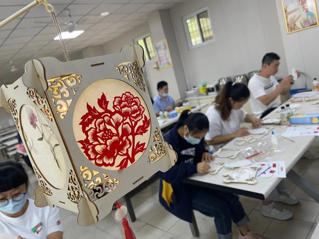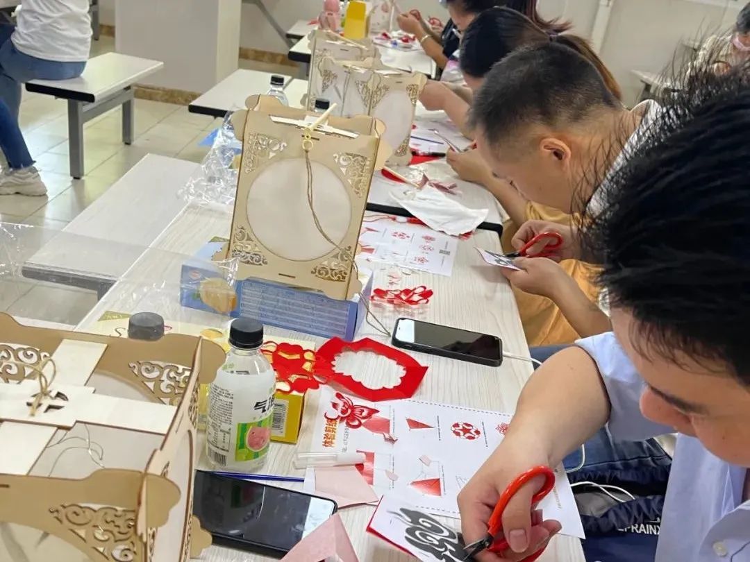 体验活动当天,闽台剪纸研学馆的刘老师,首先为大家讲解了非遗剪纸文化,介绍了剪纸作品的分类(单色剪纸、彩色剪纸)、方法技巧(折叠、阴、阳刻、刺孔)以及剪纸的相关用途。随后老师介绍了非遗剪纸的基本刀法、纹样,基础折剪知识,并带领大家一起制作了红心向党窗花。最后为大家介绍了福文化与宫灯文化,教授大家制作福文化主题剪纸,并一起装裱制作了剪纸宫灯。